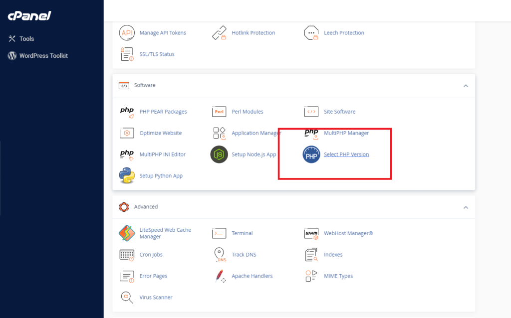 ابتدا وارد حساب میزبانی خود ( Cpanel ) شوید و مطابق تصویر پلاگین Select PHP version رو جستجو کنید و انتخاب کنید.